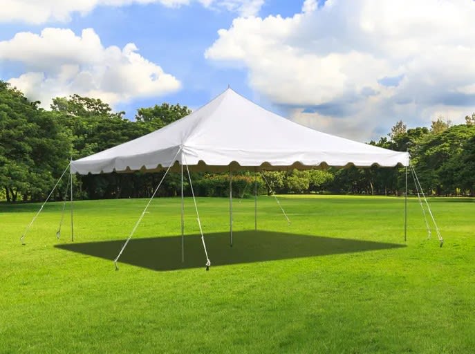 This tent is ideal for small-medium sized events. The peak canopy structure is designed for an elegant look and allows additional interior space for taller items and your guests. This tent can comfortably hold 4 standard size tables with 24 chairs. Perfect for outdoor events, this tent will surely provide shade to any event.