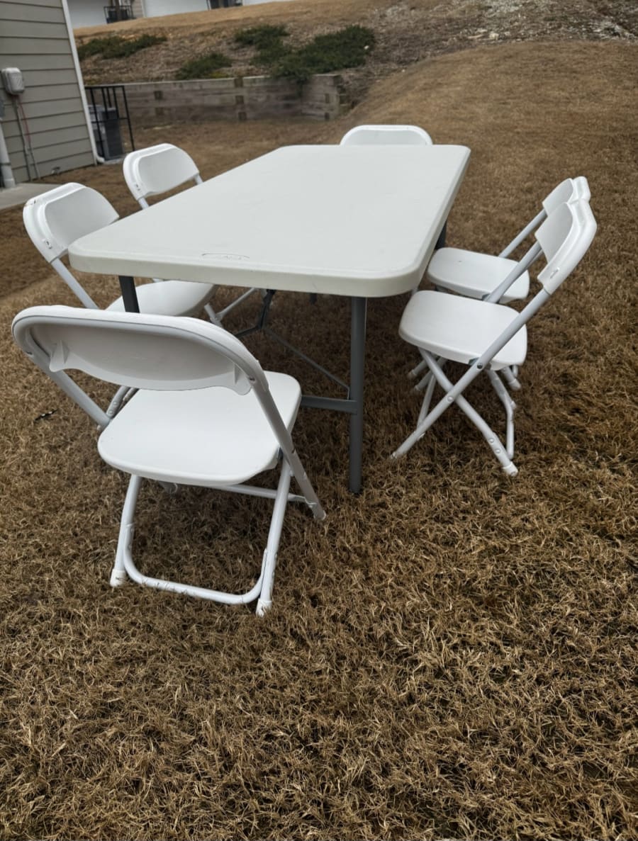 Complete your event by adding this table and chairs set perfect for kids under 10 yrs. This set includes 1 standard 4 foot folding (white) table and 6 kid size chairs (either in black or white). Multiple sets can be rented for $25 each (based on availability).