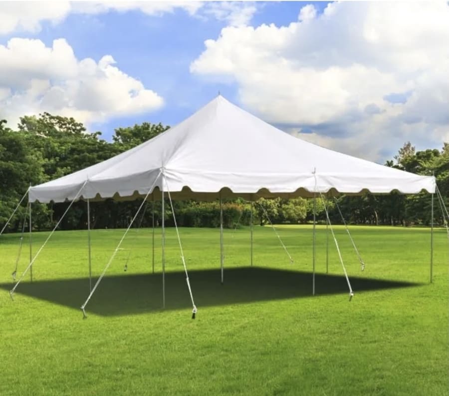 This tent is ideal for small-medium sized events. The peak canopy structure is designed for an elegant look and allows additional interior space for taller items and your guests. This tent can comfortably hold 6 standard size tables with 36 chairs. Perfect for outdoor events, this tent will surely provide shade to any event.