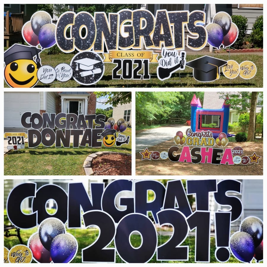 Large congrats sign + medium class of 2022 sign + name of graduate + graduation accessories. Multiple colors to chose from.